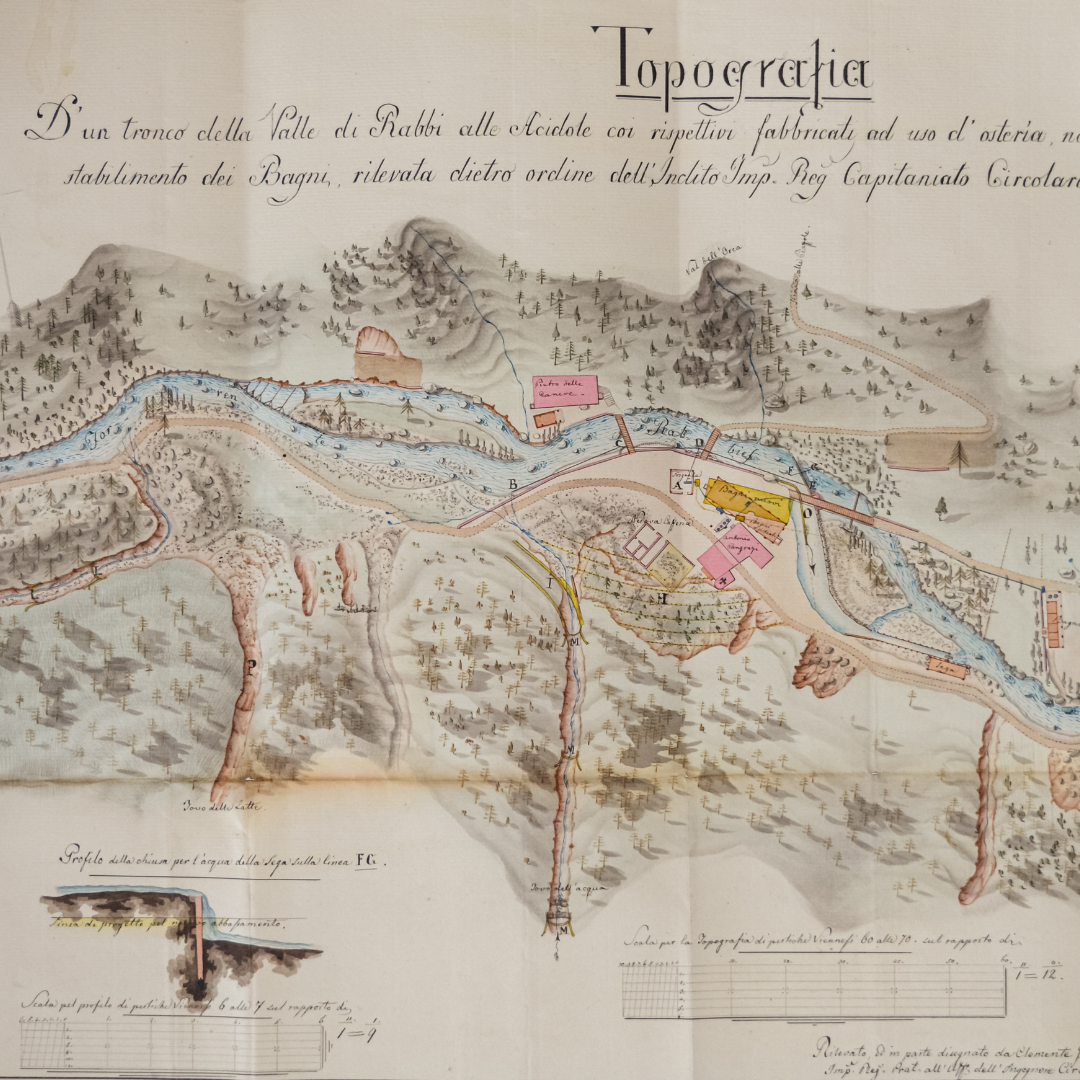The exhibition IdroGrafie. Cartografia storica delle valli di Peio e Rabbi, organised and curated by the Department of Humanities of the University of Trento and the Autonomous Province of Trento (Stelvio National Park), invites visitors to interpret the territory of the Peio and Rabbi valleys through the lens of water. The exhibition brings together both well-known and previously unpublished cartographic materials from local and international archives – topographic maps, technical surveys, sketches and thematic representations – which collectively portray the hydrological landscape of the two valleys. From the courses of streams to hydraulic works, from glacial extents to hazard maps, from thermal springs to water-powered workshops, water becomes the key to understanding how local communities have shaped and inhabited their environment over the centuries.