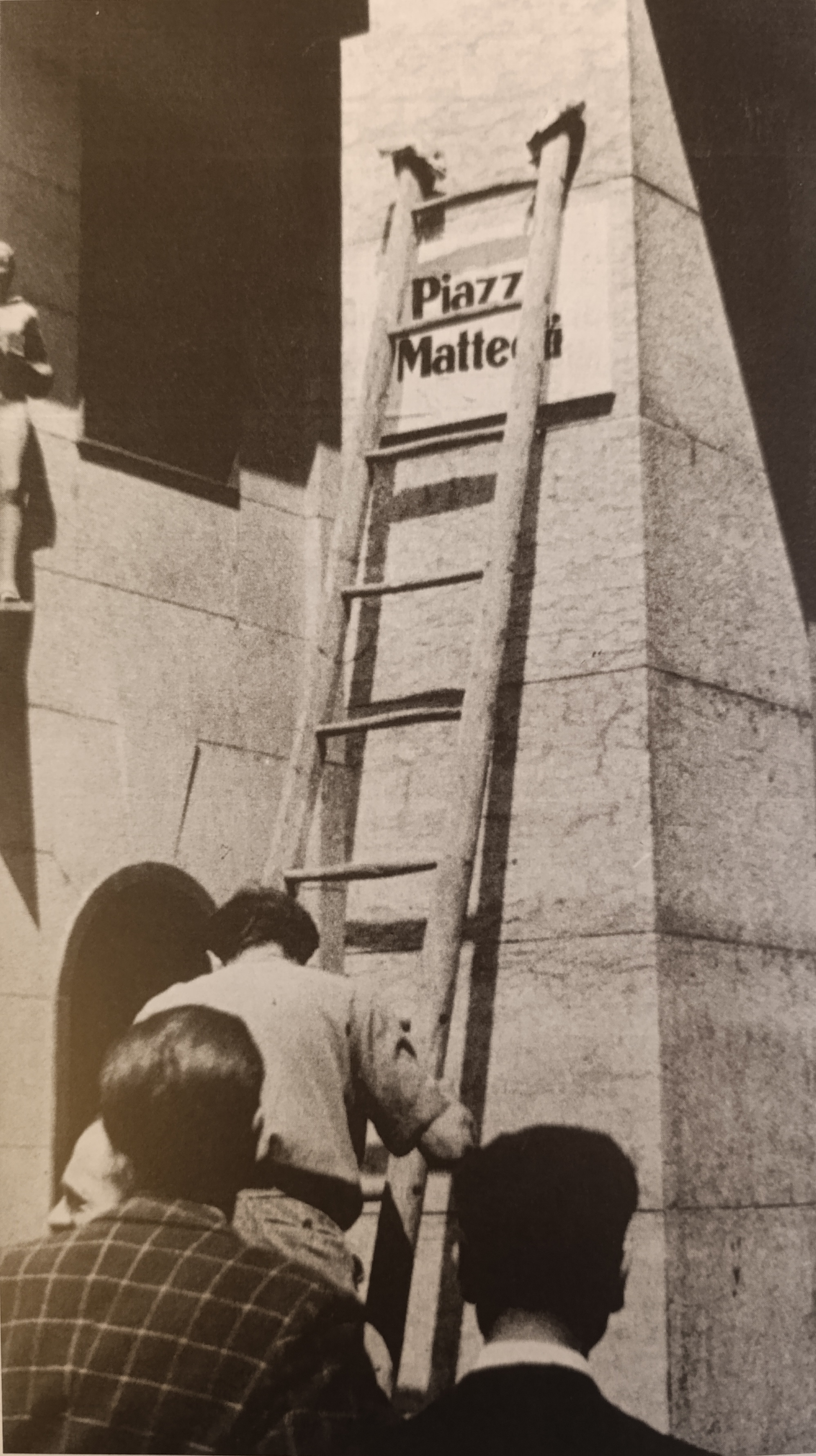 «Piazza Matteotti, oggi Piazza Cesare Battisti a Trento, nel luglio 1943. Da: Trentino Alto Adige. La nostra storia. Nomi fatti e volti di un territorio e del suo giornale, vol. 1, Bolzano 2005»
